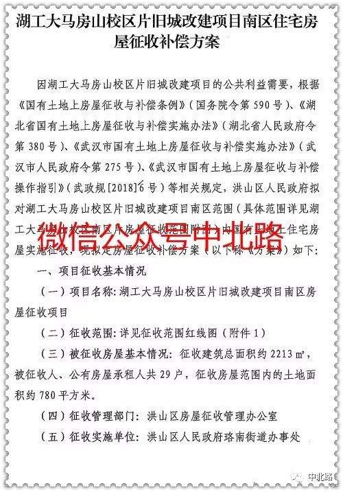微信公众号中北路(作者姜华jianghua2046)获悉,武汉洪山拆迁:湖工大马房山校区片旧城改建项目南区住宅房屋征收补偿方案。