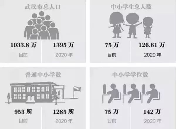 2020年前,武汉市将布局中小学1285所,总用地面积35.18平方公里,校均用地2.74公顷,可同时满足142.7万名学生上学。