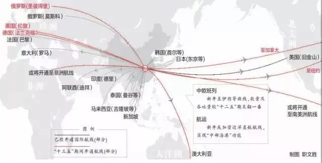 武汉是中部地区排名前列、大陆地区第六个直达四大洲的城市,目前已初步形成直达欧、美及大洋洲,覆盖东南亚、港澳台的国际及地区航线网络。