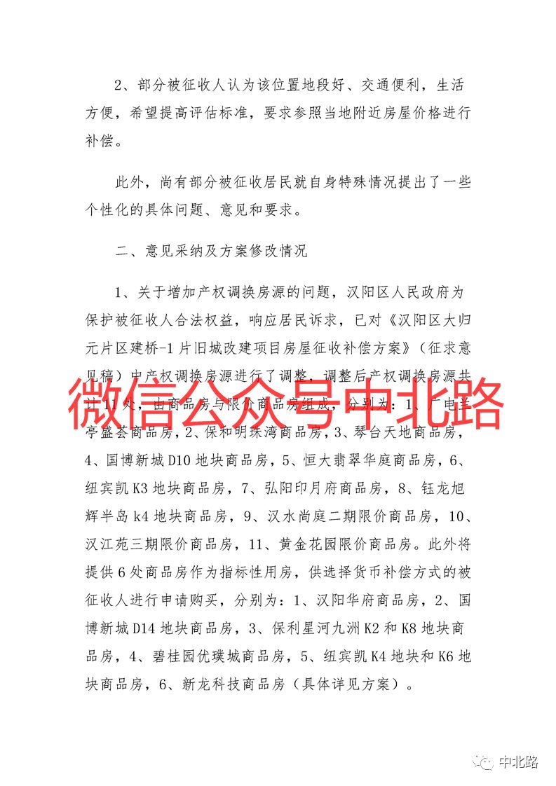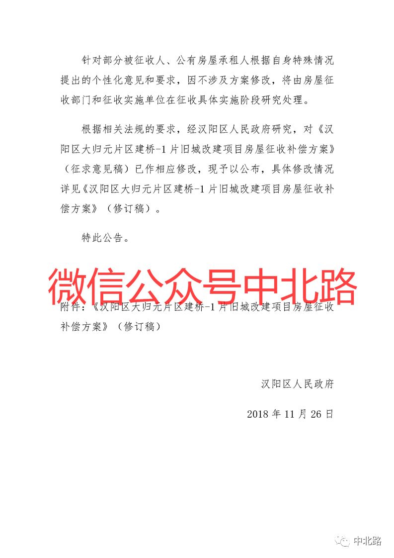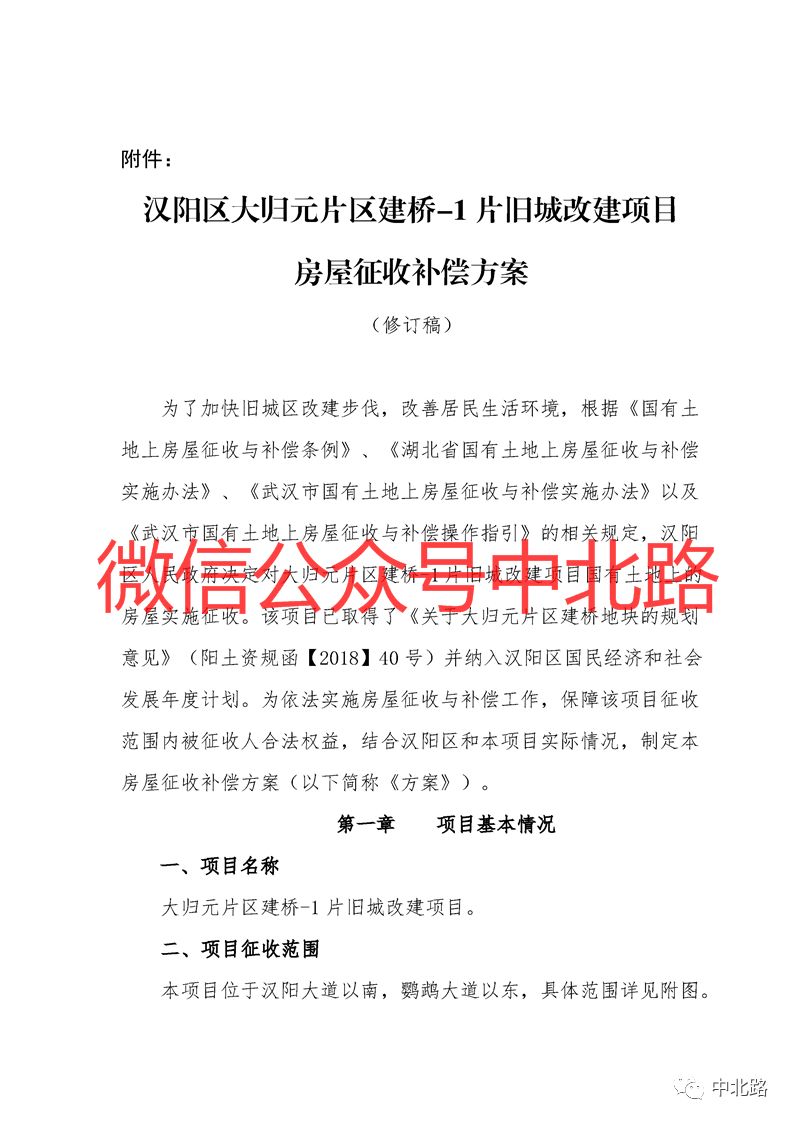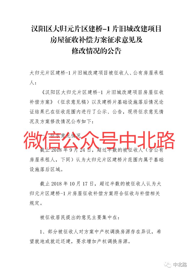 微信公众号中北路(作者姜华jianghua2046)获悉,汉阳区大归元片区建桥1-5片旧城改建项目房屋征收补偿方案征求意见及修改情况的公告。
