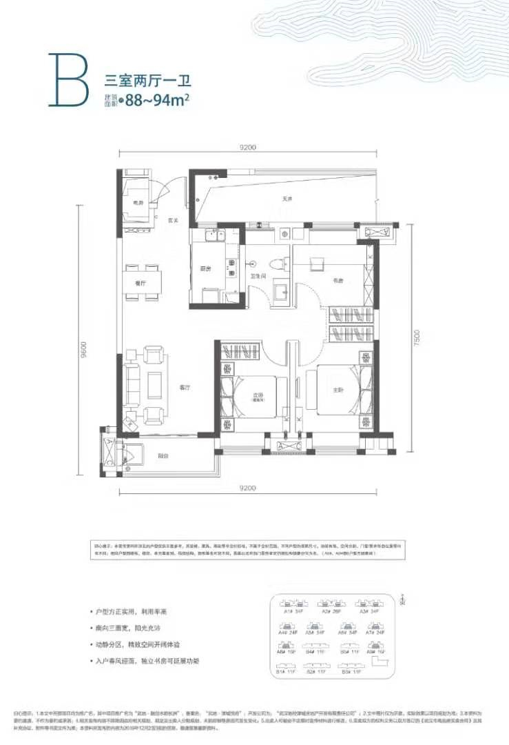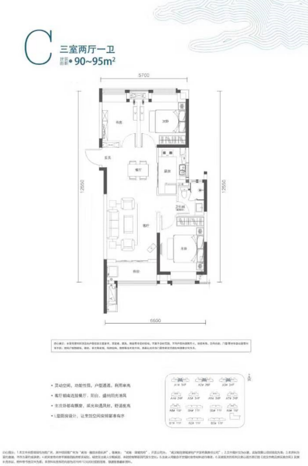 【武地融创水韵长洲】90-95㎡户型-3室2厅1卫-90.0m²