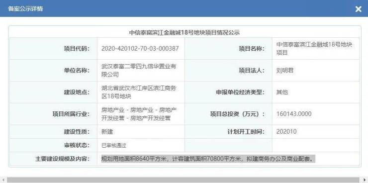 日前,武汉市自然资源和规划局对武汉泰富二零四九信华置业有限公司新建商业项目(二七沿江商务核心区北片18号地块)规划方案进行了批前公示。规划用地面积8640平方米,计容建筑面积70800平方米,拟建商务办公及商业配套,总投资16个亿,包含一栋超200米超高层。