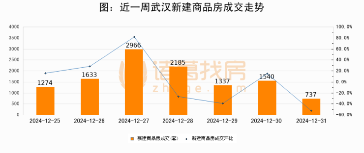 根据武汉市住房保障和房屋管理局数据显示,2024年12月31日武汉新建商品房成交737套,较昨日减少803套,环比下降52.1%