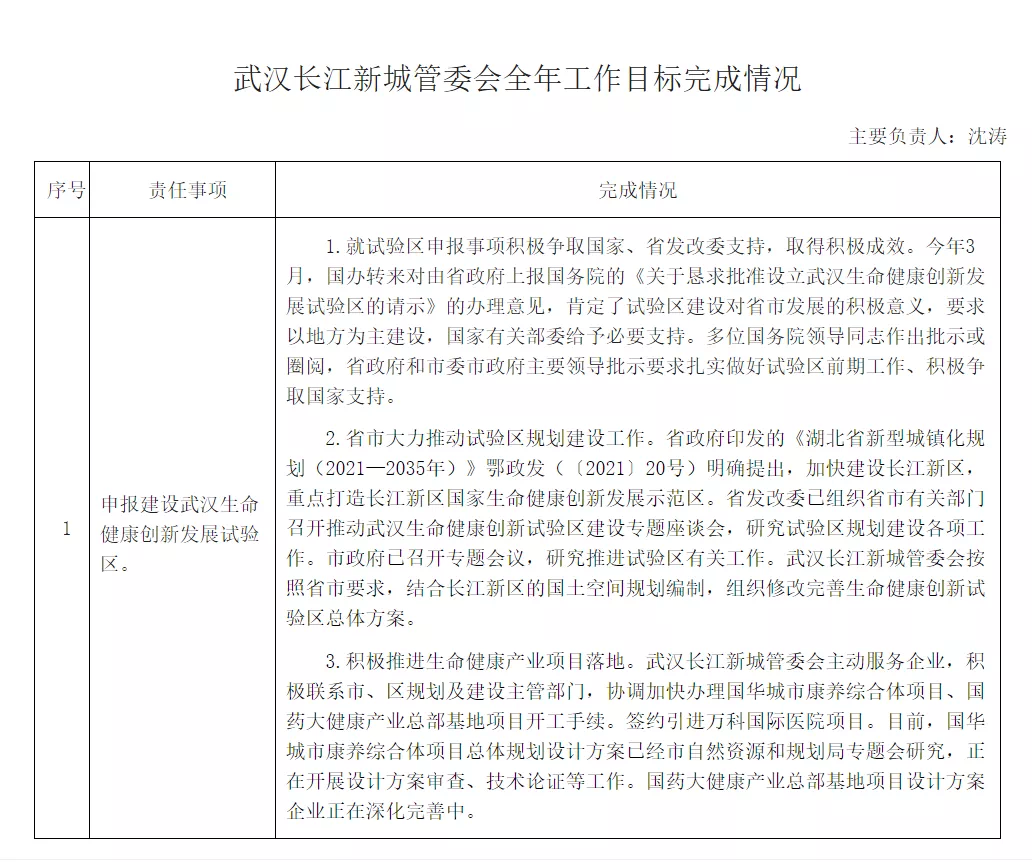 1月29日消息,搜狐焦点获悉,1月27日,长江新城管委会2021年全年工作目标完成情况公布,2021年长江新城管委会责任事项,为申报建设武汉生命健康创新发展试验区,已签约引进万科国际医院项目,相关完成情况如下: