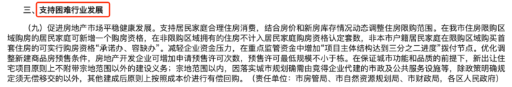 为缓解企业困难,16条就专门提到,为减轻企业资金压力,在重点监管资金中增加“项目主体结构达到三分之二进度”拨付节点;优化调整新建商品房预售条件,房地产开发企业可增加申请预售许可次数,预售许可最低规模不小于栋;在保证城市功能和品质的前提下,新出让住宅项目原则上不附带宗地范围以外的建设义务;同时下调竞买保证金,允许银行出具保函代替竞买保证金,除竞买保证金之外的剩余土地出让价款,允许在1年内缴清,特殊项目可2年内缴清。