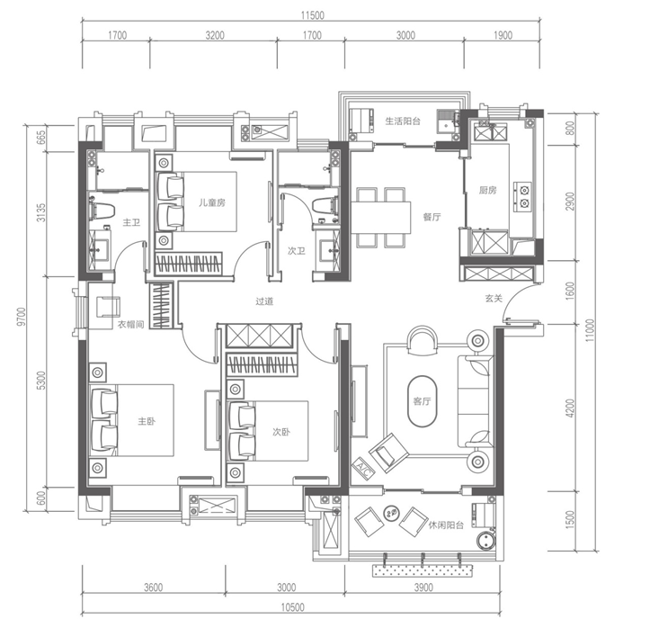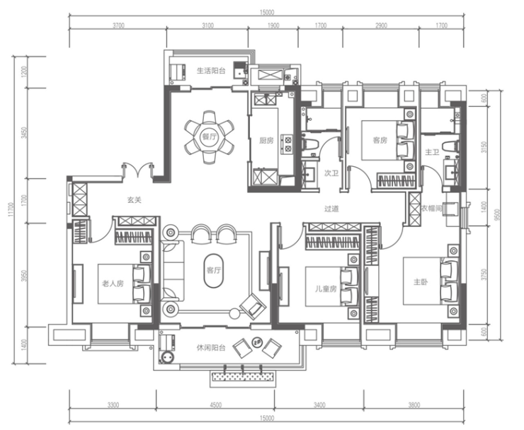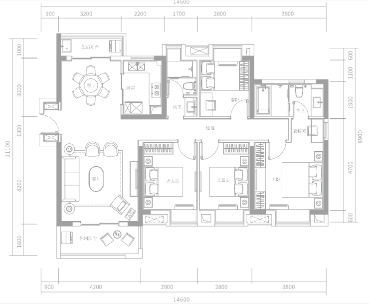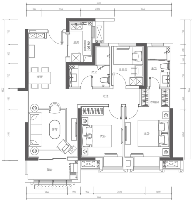 户型通透,南北双向阳台,4.2米宽开间尺度。