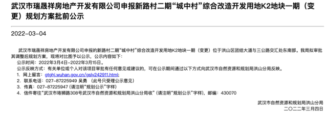 3月9日消息,搜狐焦点获悉,据武汉市自然资源和规划局洪山分局,武汉市瑞晟祥房地产开发有限公司申报新路村二期“城中村”综合改造开发用地K2地块一期(变更)规划方案批前公示。