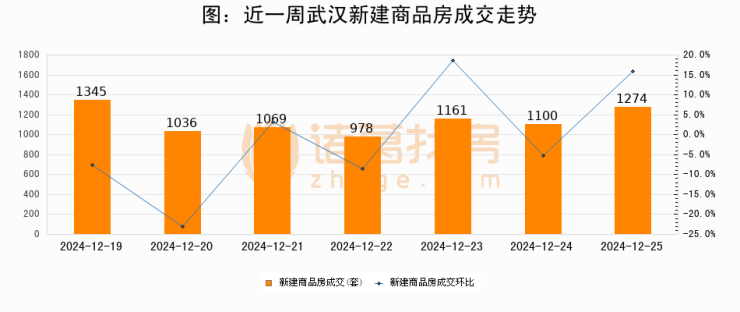 根据武汉市住房保障和房屋管理局数据显示,2024年12月25日武汉新建商品房成交1274套,较昨日增加174套,环比上涨15.8%