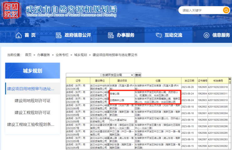 近日,武汉市自然资源和规划局公示了建设项目用地预审与选址意见书,光谷中心城两个公园项目:云栖森林公园 、荷塘公园。