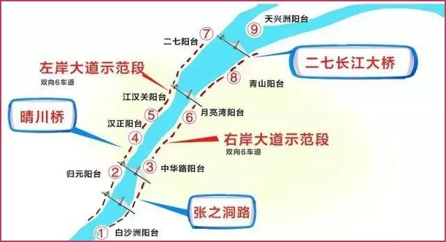 右岸大道即临江大道,横跨武昌古城区和滨江商务区,串联青山、月亮湾、中华路、白沙洲四大城市阳台。