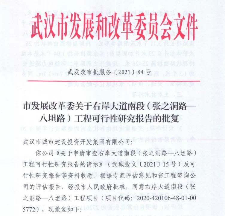 7月1日,市发改委发布重要文件——关于右岸大道南段(张之洞路-八坦路)工程可行性研究报告的批复。