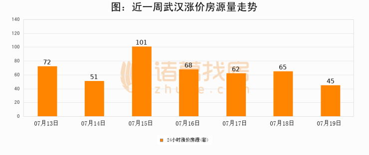 根据诸葛找房数据显示,武汉24小时涨价房源量为45套,较07月18日减少20套,环比下降30.8%。与此同时,涨价房源占比小幅回落,对于购房者来说是一个入市窗口期,购房者可抓住时机入市。