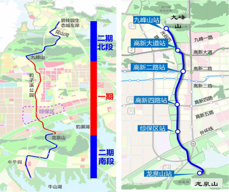 正在如火如荼建设之中的光谷空轨,一期工程线路全长约10.5公里,起于九峰山、止于龙泉山,串联两端的九峰国家森林公园、龙泉山明楚王墓考古遗址公园等旅游资源;同时,可与地铁11号线、光谷有轨电车L2换乘,方便乘客游玩光谷生态大走廊和沿线景点。