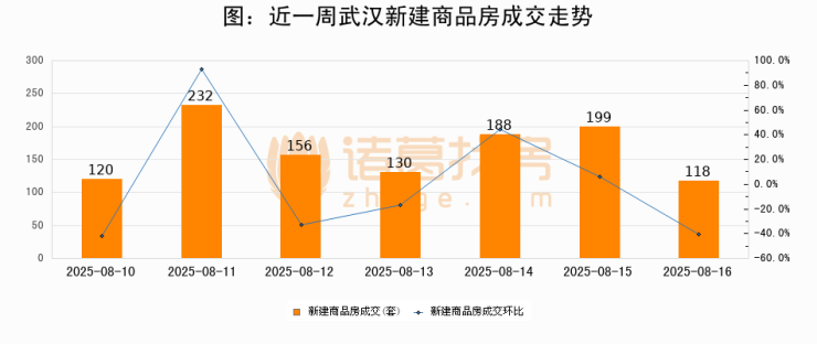 根据武汉市住房保障和房屋管理局数据显示,2025年08月16日武汉新建商品房成交118套,较昨日减少81套,环比下降40.7%。近一周武汉新建商品房日均成交164套。08月16日单日成交118套,低于近一周平均水平28%。