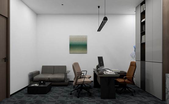 办公室设计以"以人为本、高效协同、现代简约"为核心理念,旨在打造一个兼具功能性与舒适性的办公环境。空间布局采用开放式与封闭式相结合的方式,开放式办公区促进团队协作与信息流通,独立办公室则保障管理层的私密性与专注度。色彩上以浅灰、米白为主色调,搭配原木色点缀,营造宁静、专业的氛围,同时通过局部亮色挂画与绿植增添活力。