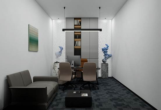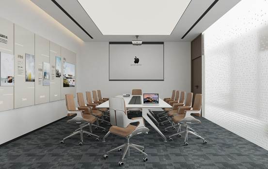 延续现代简约+轻商务的理念,摒弃冗余装饰,以“简洁线条、通透质感、实用美学”为核心,打造兼具专业感与舒适感的办公会议场景,契合科技型、创新型企业的品牌气质。以高级白(墙面、顶面)为基底,搭配深灰几何纹地毯,营造冷静、理性的思考氛围,同时通过色彩对比强化空间层次感。座椅选用暖棕色皮革,中和冷色调的距离感,传递温暖、亲和的情绪;会议桌与部分家具的银白质感,则提升了科技感与精致度,呼应现代办公的高效属性。
