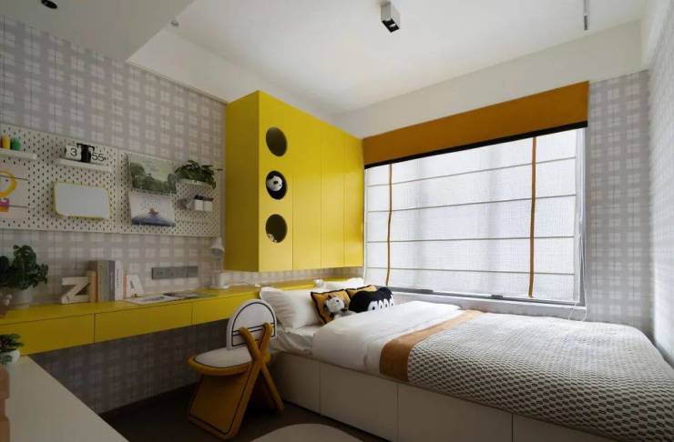 孩童房以热门游戏《蛋仔派对》中的经典角色蛋小黄为设计灵感源泉,将明快活泼的黄色作为空间视觉焦点,巧妙融入各个角落,营造出充满童趣与活力的梦幻氛围。