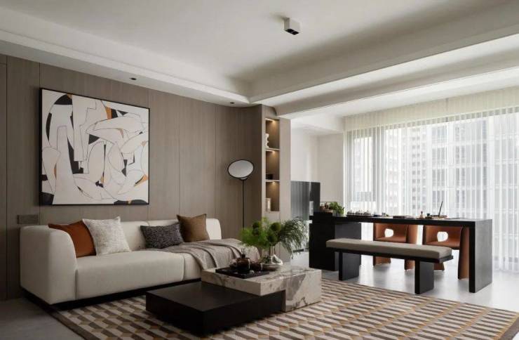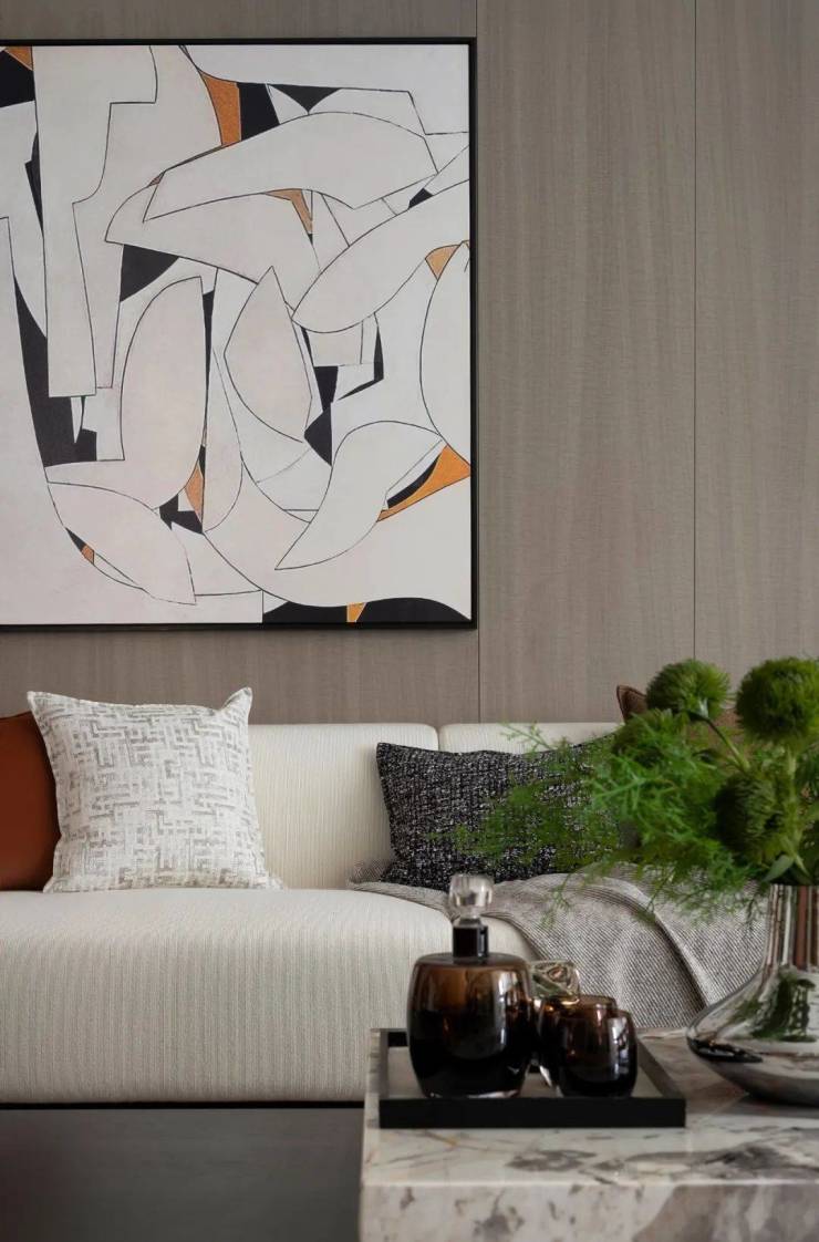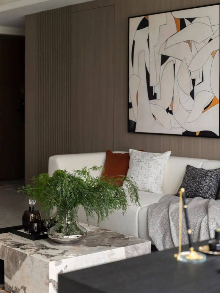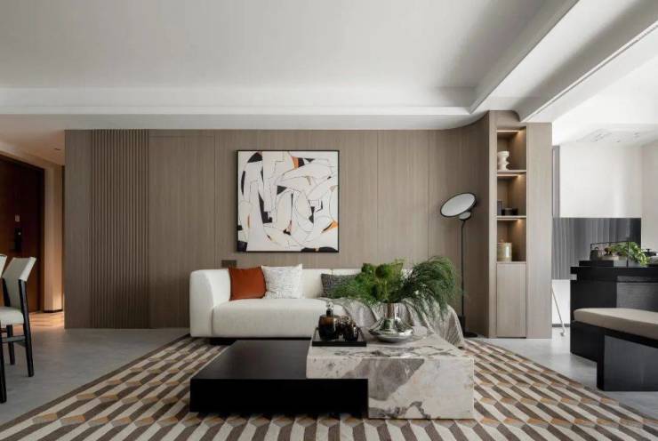 沙发背景墙采用浅胡桃色木饰面,温润的木质纹理传递自然质感。墙上悬挂的抽象挂画,以艺术笔触打破单调,通过材质的冷暖对比与视觉元素的巧妙融合,赋予墙面立体层次感,让整个空间兼具时尚格调与艺术氛围。