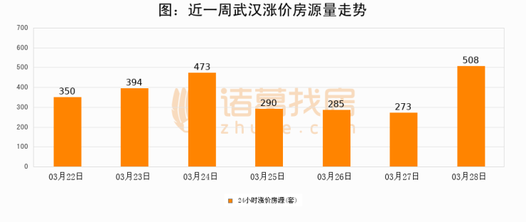 根据诸葛找房数据显示,武汉24小时涨价房源量为508套,较03月27日增加235套,环比上涨86.1%。与此同时,涨价房源占比小幅扩大,业主信心有所提升。