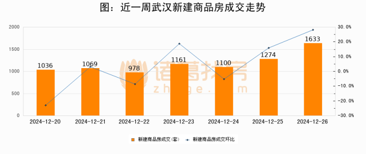 根据武汉市住房保障和房屋管理局数据显示,2024年12月26日武汉新建商品房成交1633套,较昨日增加359套,环比上涨28.2%