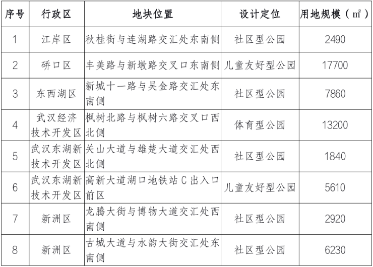 这次即将打造的8个口袋公园,涉及江岸、硚口、东西湖等多个区具体点位已经公布,目前正在面向社会征集优秀设计方案。