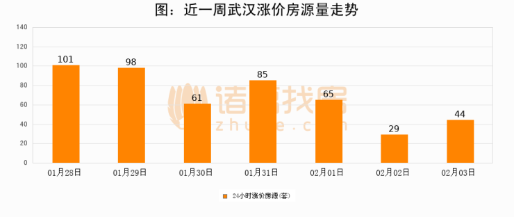 根据诸葛找房数据显示,武汉24小时涨价房源量为44套,较02月02日增加15套,环比上涨51.7%。与此同时,涨价房源占比小幅扩大,业主信心有所提升。