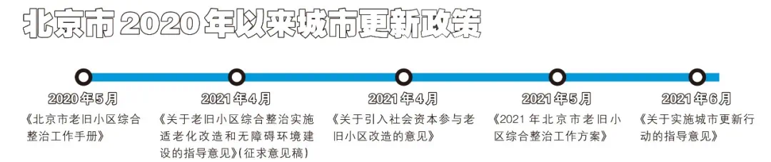 加上此前出台的《关于引入社会资本参与老旧小区改造的意见》《2021年北京市老旧小区综合整治工作方案》,构成了北京城市更新的完整政策体系。