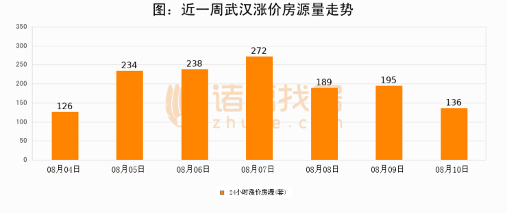 根据诸葛找房数据显示,武汉24小时涨价房源量为136套,较08月09日减少59套,环比下降30.3%。与此同时,涨价房源占比小幅回落,对于购房者来说是一个入市窗口期,购房者可抓住时机入市。