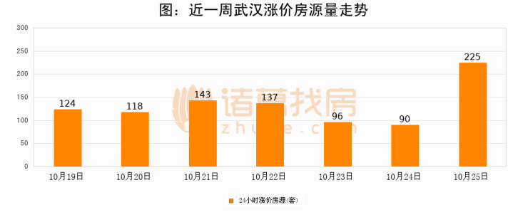根据诸葛找房数据显示,武汉24小时涨价房源量为225套,较10月24日增加135套,环比上涨150%。与此同时,涨价房源占比小幅扩大,业主信心有所提升。