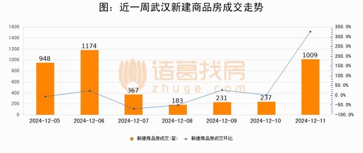 根据武汉市住房保障和房屋管理局数据显示,2024年12月11日武汉新建商品房成交1009套,较昨日增加772套,环比上涨325.7%