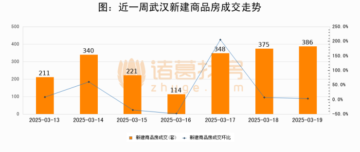 根据武汉市住房保障和房屋管理局数据显示,2025年03月19日武汉新建商品房成交386套,较昨日增加11套,环比上涨2.9%