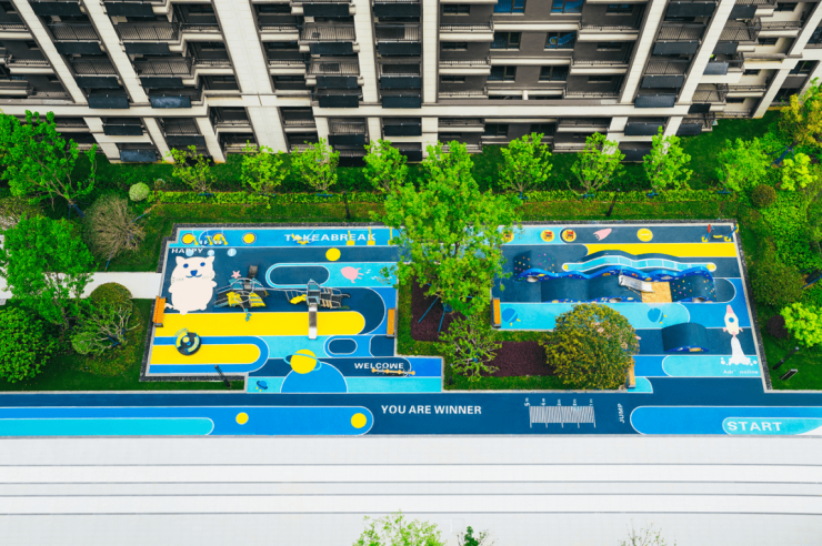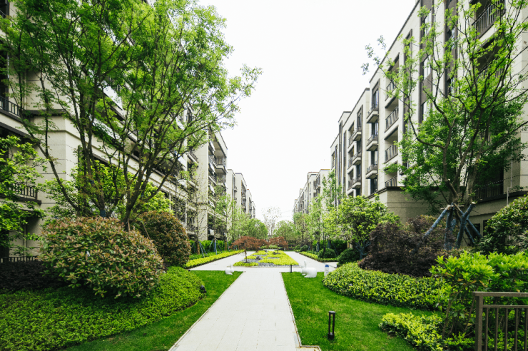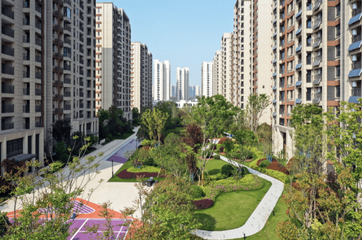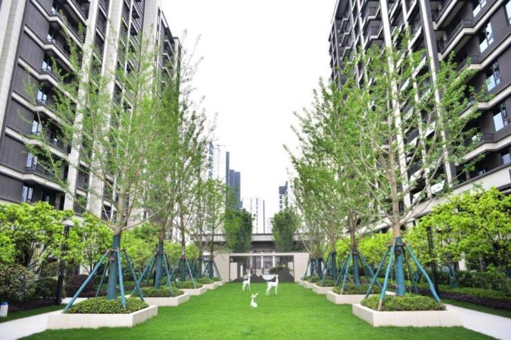 整个园区项目结合门楼、景墙、会客厅等节点依次设计了高大的丛生榉树树阵、挺拔的银杏树阵、温馨可爱的球阵、古典的枯山水、静谧的乌桕林等;南北向轴线以丛生栾树为骨架树,打造绿意盎然的林下空间。每一条巷道都有特有的主题设计,如日本晚樱、西府海棠、丛生紫薇、日本早樱等不同花期的花乔和可观果的丛生杨梅等,阳逻金茂希望给业主的不只是绿化,更有和环境、和四季的互动。