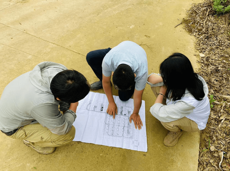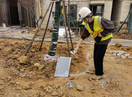 在施工阶段,找到符合设计要求的苗木,其实要去很多的地方、很多的苗圃甚至山林野地,再经过长途的运输来到场地。当经过几番周折的树木到场时,还需要进行多轮调整,要考虑空间的错落有致、开合有度、考虑人的行动路线和视线所及、不同种植形式所带来的不同感受、植物对住户的采光影响、住户私密度的保护等多重角度,将植物搭配场景进行点位和朝向的精调,最终每棵植物拥有各自“最适合的位置”。