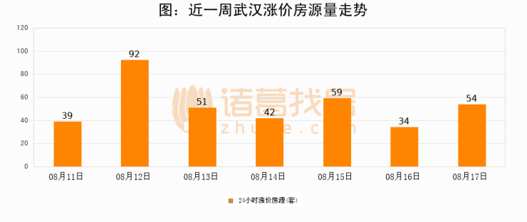 根据诸葛找房数据显示,武汉24小时涨价房源量为54套,较08月16日增加20套,环比上涨58.8%。与此同时,涨价房源占比小幅扩大,业主信心有所提升。