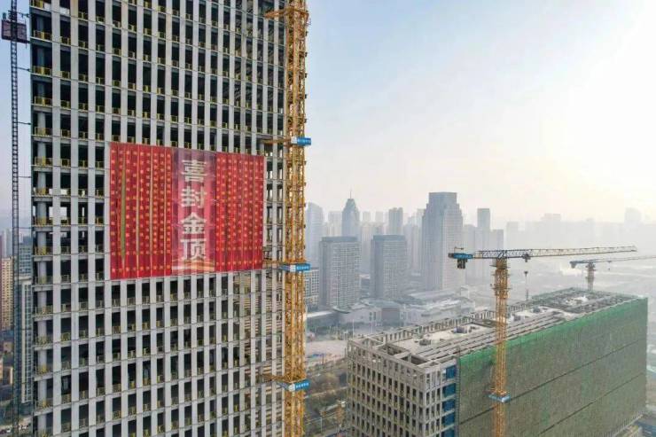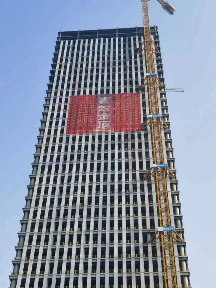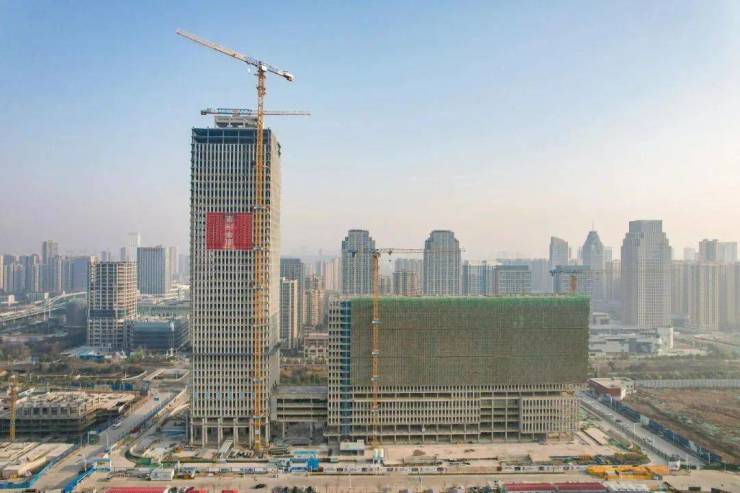 该项目于2020年6月9日正式开工,2021年5月12日工程桩施工完成,2021年7月24日主楼底板进行大体积混凝土浇筑,2022年4月30日地下室全部实现结构封顶,2022年9月完成副楼封顶,2023年1月18日迎来主楼主体结构封顶,项目进度节点节节攀升!