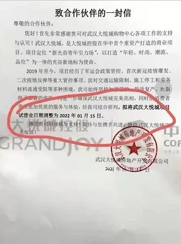 11月17日消息,搜狐焦点获悉,近日,有网友在城市留言板上咨询光谷中心城的武汉大悦城开业时间,一则武汉大悦城房地产开发有限公示致合作伙伴的一封信中透露,武汉大悦城项目试营业日期调整为2022年1月15日,项目开业时间由之前的2021年12月18日往后延期了一个月。