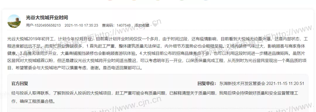武汉城市留言板留言而匆忙开业弊端很多,1、首先赶工严重,整体建筑质量无法保证,内外细节方面势必也会粗糙呈现。2、场内装修气味过大,影响顾客与商家身体健康。3.品牌无法同步开业,大量商铺围挡装修也会影响顾客游玩体验。4、大悦城目前公布的招商品牌亮点不多,也可以利用这段时间进一步精进品牌矩阵。虽然片区居民对大悦城翘首以盼,但还是建议光谷大悦城将开业时间适当推迟,可以考虑明年五一开业,以保质保量完成工程,从而到时为光谷居民呈现出一个高品质的项目,希望管委会与大悦城地产可以慎重考虑。东湖新技术开发区管委会回复:赶工严重可能会有质量问题,已解释清楚关于质量问题,我局后续会持续做好质量和安全监督管理工作,确保工程质量合格。2021年11月16日,一则武汉大悦城致合作伙伴的一封信在网上流传,原文如下:
