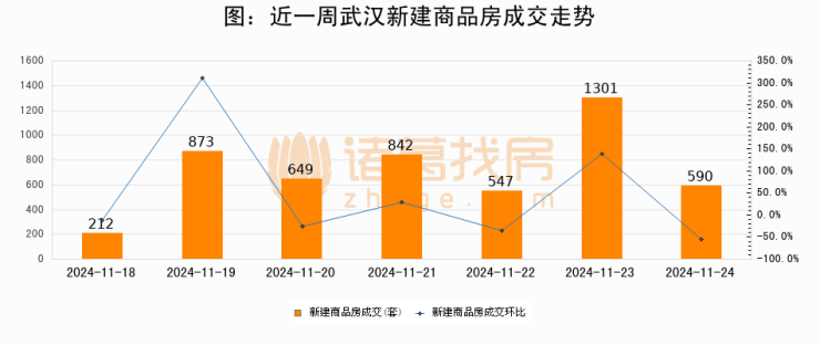 根据武汉市住房保障和房屋管理局数据显示,2024年11月24日武汉新建商品房成交590套,较昨日减少711套,环比下降54.6%