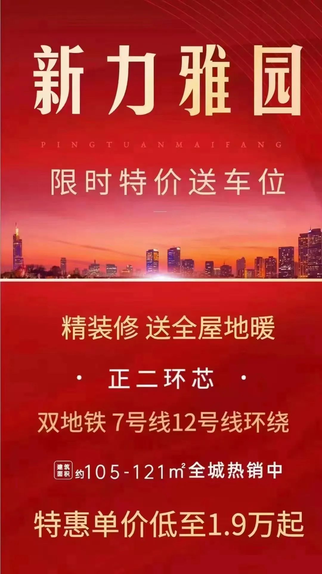 位于洪山南湖路的天地新力雅园推出限时特价送车位活动,精装修送全屋地暖!建面约105-121平,特惠单价低至1.9万起!