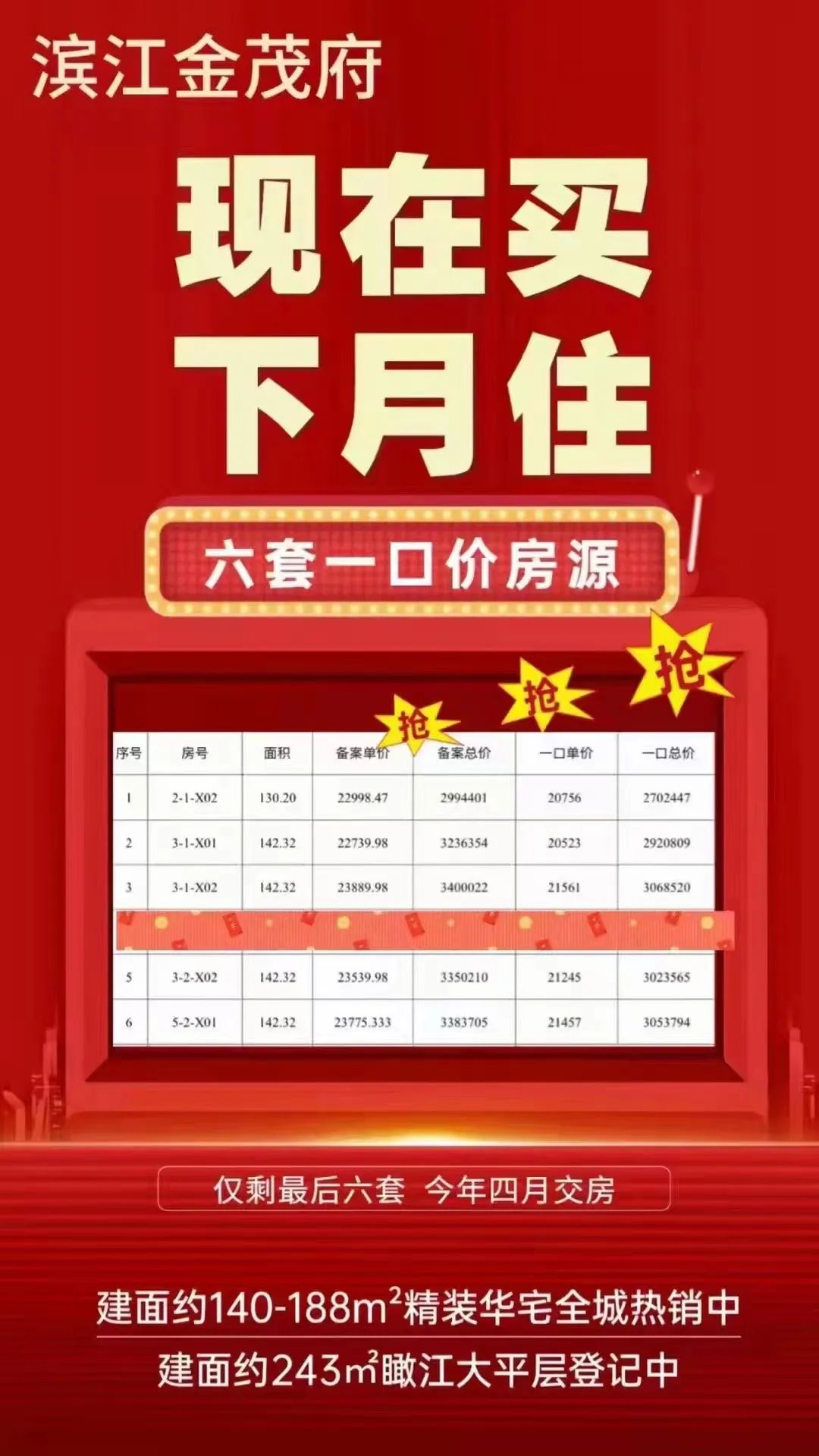 位于汉阳晴川大道与两湖路交汇处的滨江金茂府推出6套一口价房源,均分布于2、3、5号楼,建面约130.20-142.32平,一口单价低至20523元/平,一口总价低至2702447元!