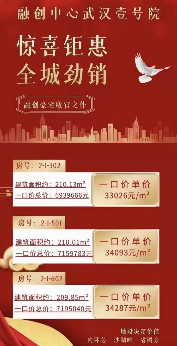 位于沙湖大道与公正路交汇处的融创中心武汉壹号院推出3套一口价房源,均分布于2号楼,建面约209.85-210.13平,一口价单价低至33026元/平,一口价总价低至6939666元!