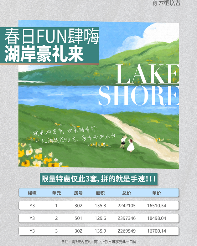 位于江夏区黄家湖南岸山湖大道的弘阳云栖玖著推出3套限量特惠房源,均分布于Y3号楼,建面约129.6-135.9平,特惠单价低至16510.34元/平,折后总价低至2242105元!