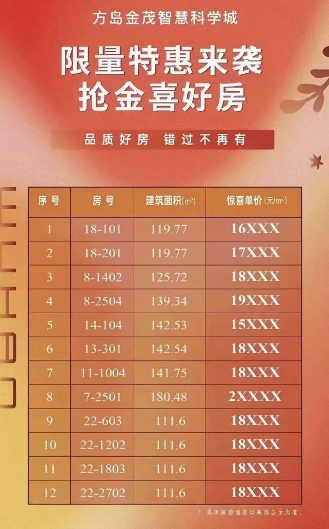位于汉阳区四新的方岛金茂智慧科学城推出12套限量特惠房源,均分布于7、8、11、13、14、18、22号楼,建面约111.6-180.48平,惊喜单价低至15XXX元/平!