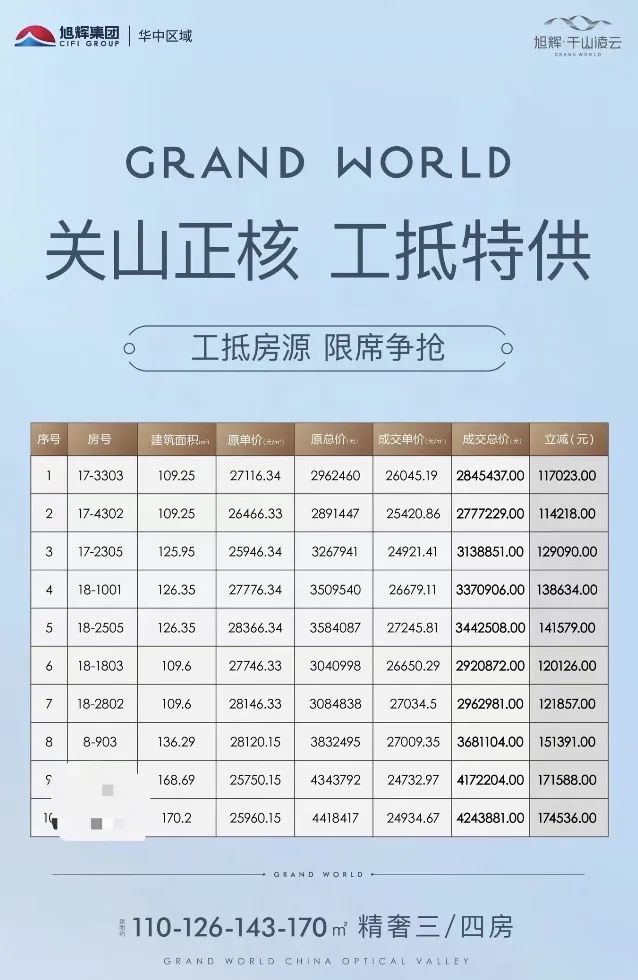 位于光谷大道与高新二路交汇处的旭辉千山凌云推出10套工抵房源,均分布于17、18、8号楼,建面约109.25-168.69平,折扣单价低至25750.15元/平,折后总价低至2777229元,总价较高直降174536元!