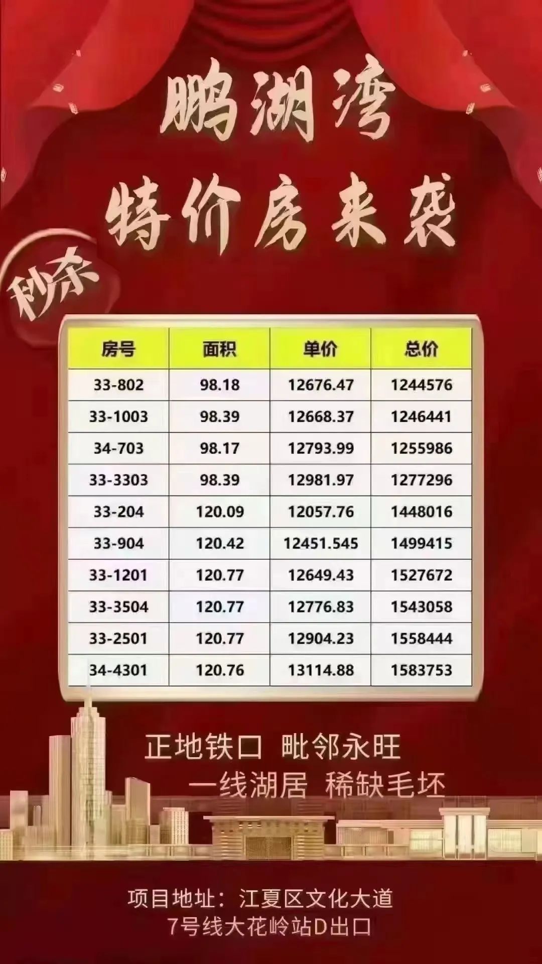 位于江夏大花岭板块的鹏湖湾推出10套特价房源,均分布于33、34号楼,建面约98.17-120.77平,特惠单价低至12057.76元/平,特惠总价低至1244576元!