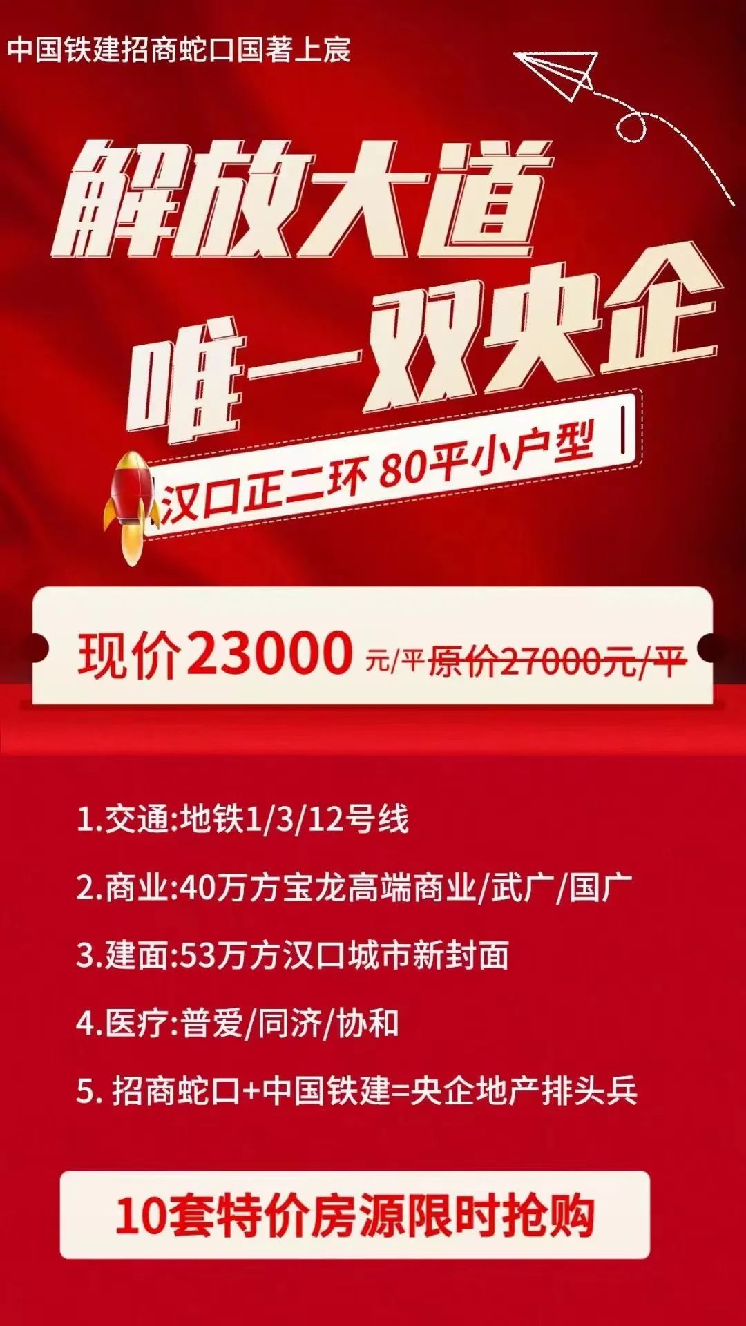 位于硚口区解放大道与建设大道交汇处的中国铁建招商蛇口国著上宸推出10套特价房源,80平小户型,现价23000元/平,单价直降4000元!