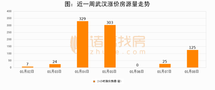根据诸葛找房数据显示,武汉24小时涨价房源量为125套,较05月07日增加100套,环比上涨400%。与此同时,涨价房源占比小幅扩大,业主信心有所提升。
