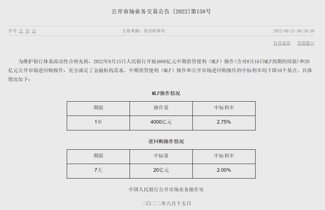 据悉,中期借贷便利(MLF)操作和公开市场逆回购操作的中标利率均下降10个基点,分别报2.75%、2.00%。
