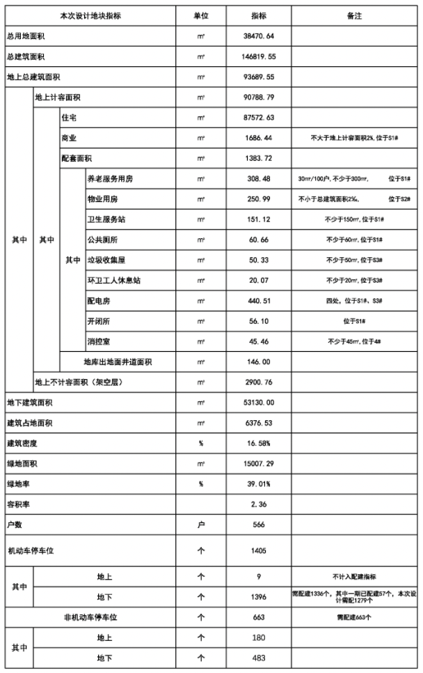 规划建筑密度16.58%,绿地率39.01%,容积率2.36,户数566户,机动车停车位1405个,其中地上9个,地下1396个;非机动车停车位663个,其中地上180个,地下483个。