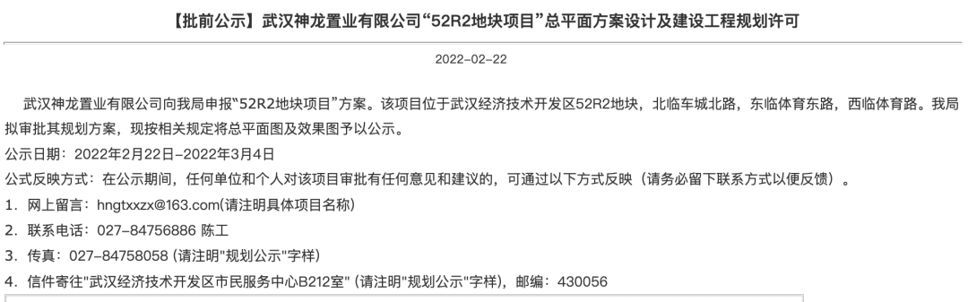 2月28日消息,搜狐焦点获悉,根据武汉开发区(汉南区)国土规划局发布《武汉神龙置业有限公司“52R2地块项目”总平面方案设计及建设工程规划许可》批前公示。
